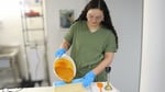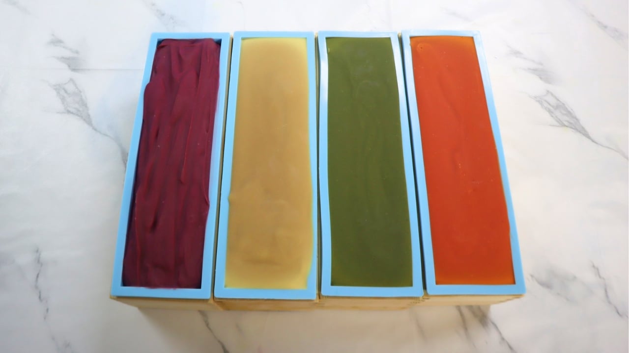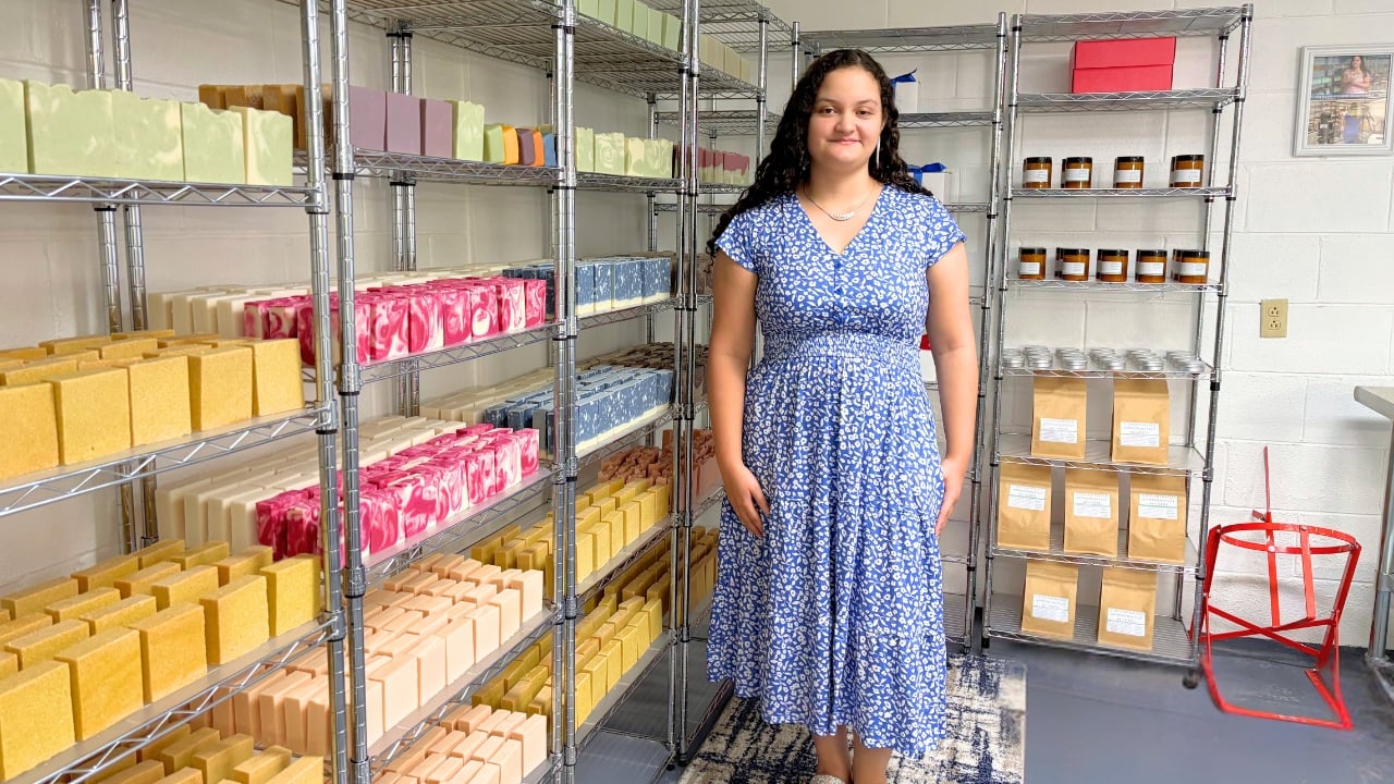 Cadence Rose pouring orange soap batter, along with photos of multi-colored soap bars.